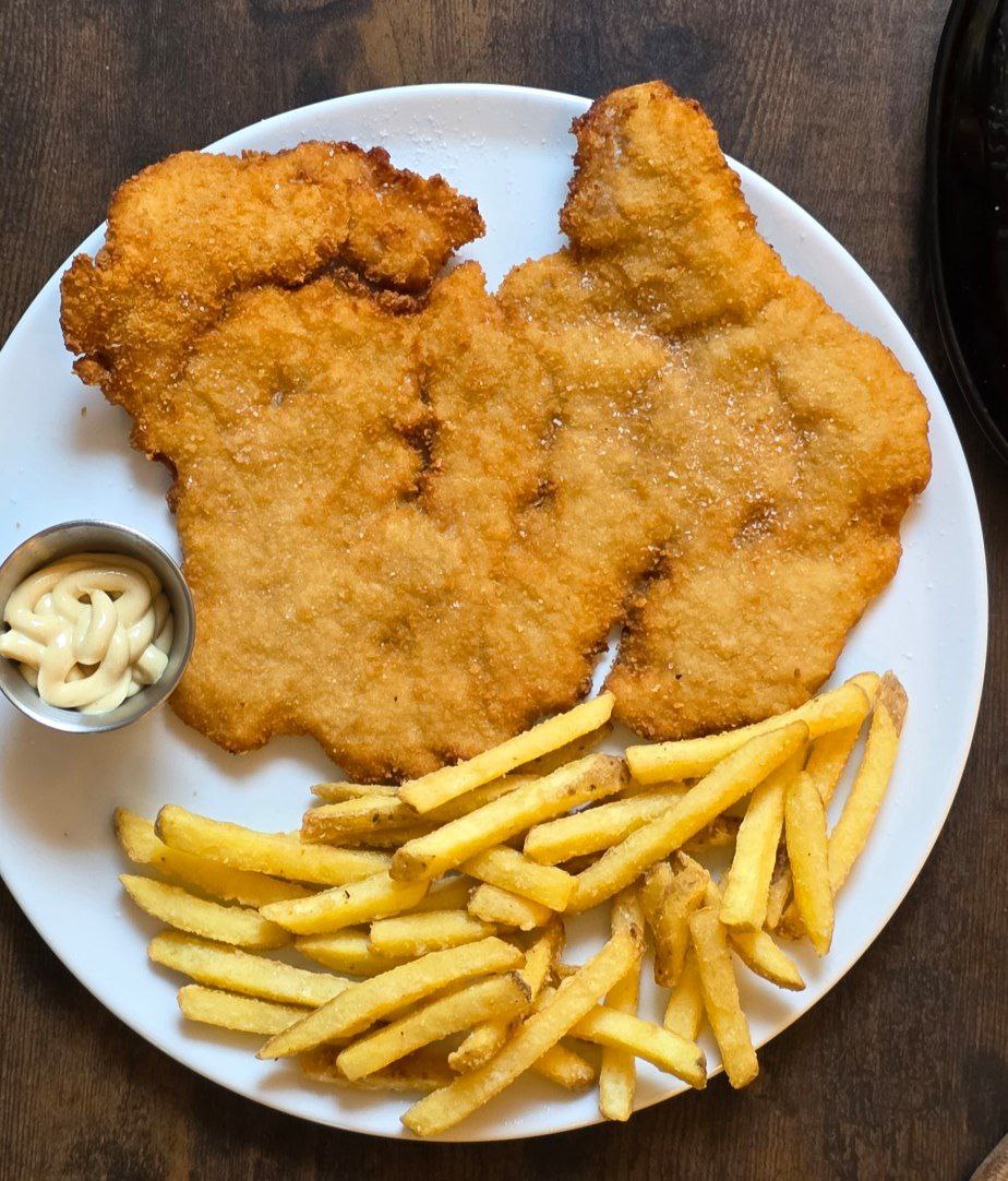 maxi cotoletta di lonza di maiale con contorno di patate fritte