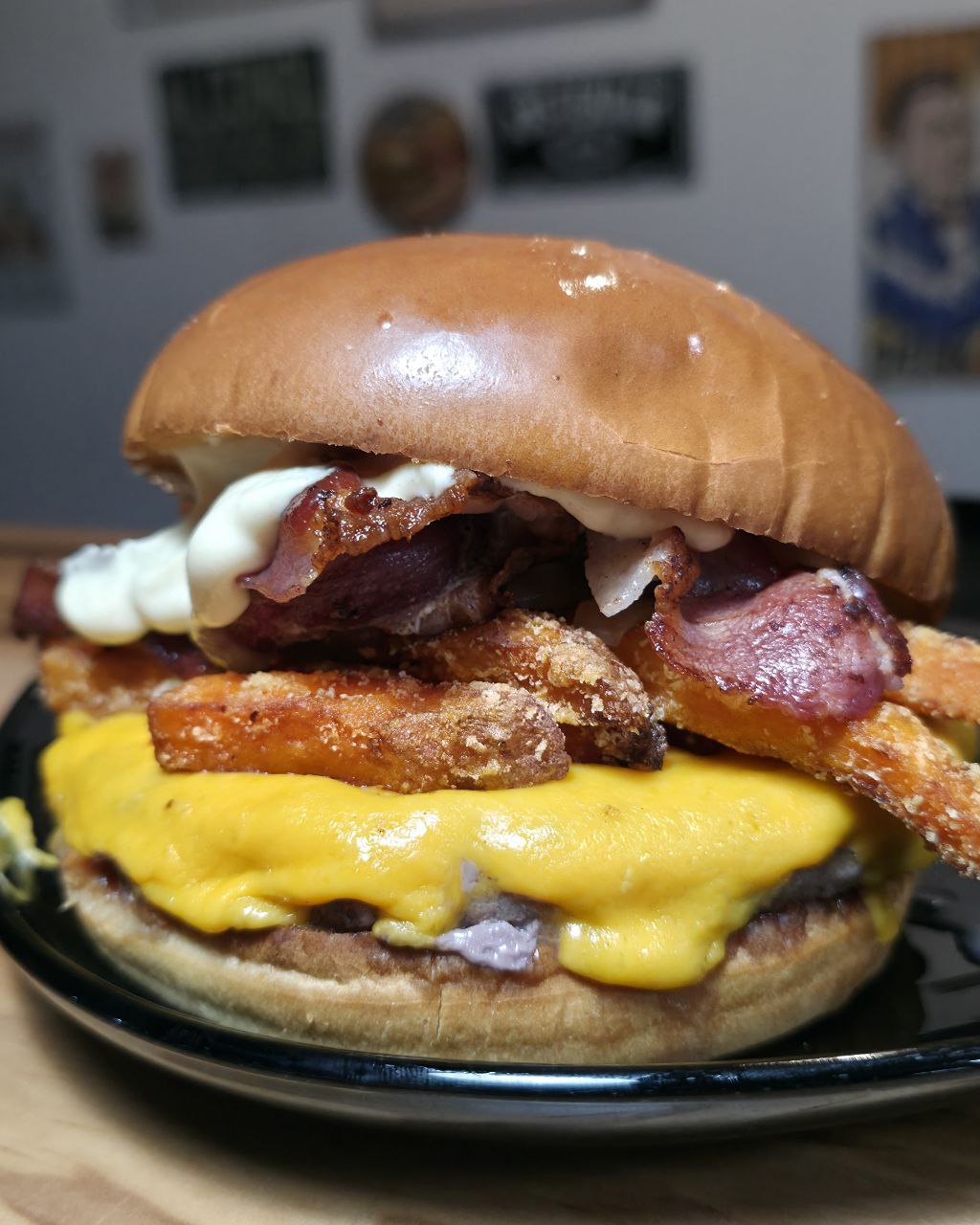 brioche bun, hamburger di angus da 200g, cheddar, patate dolci americane , cipolle caramellate e salsa honey BLOOM, bacon croccante