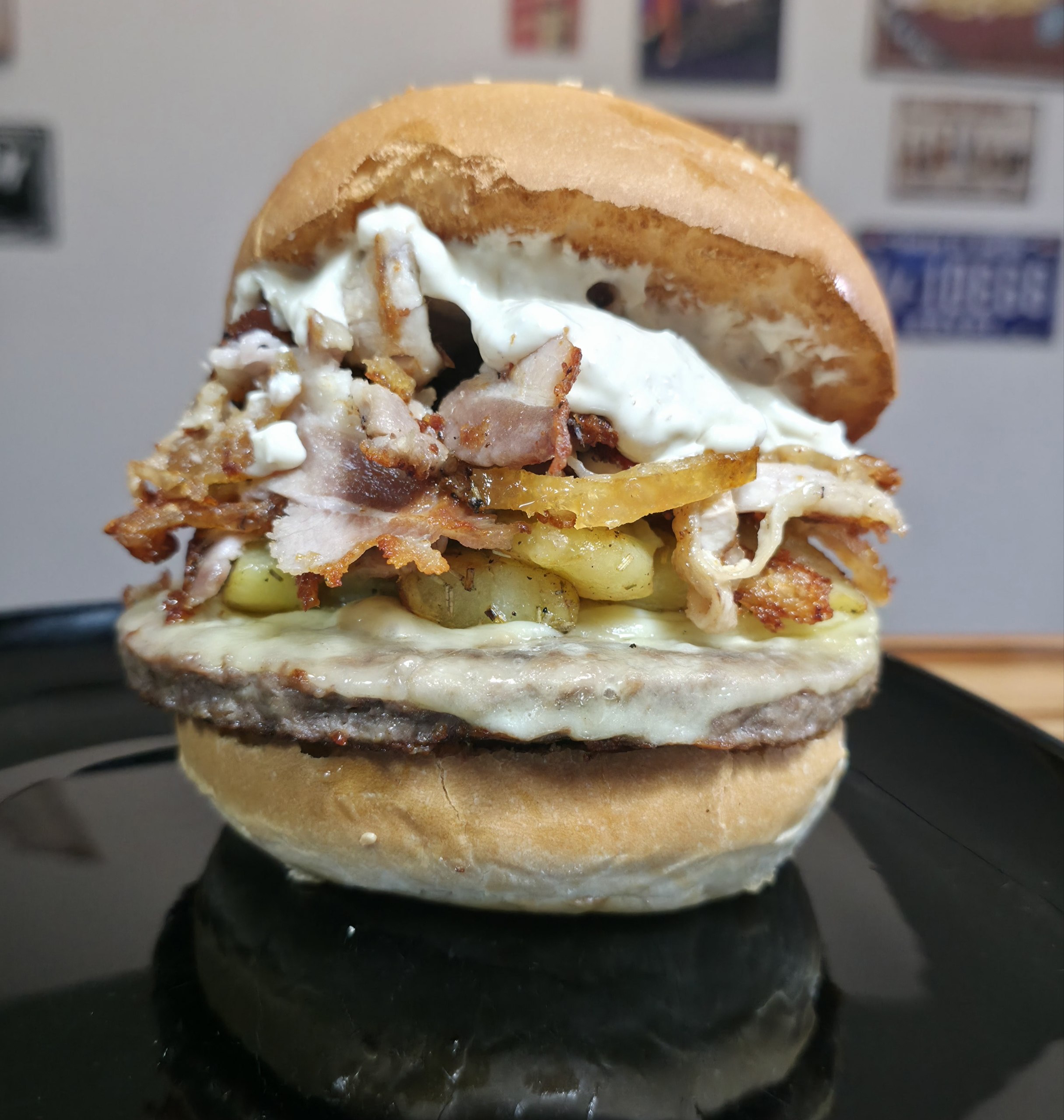 bun artigianale, hamburger di scottona da 150g, provola dolce, patate al forno, abbondante e profumata porchetta home made, salsa boscaiola, cipolle caramellate. controno patatine